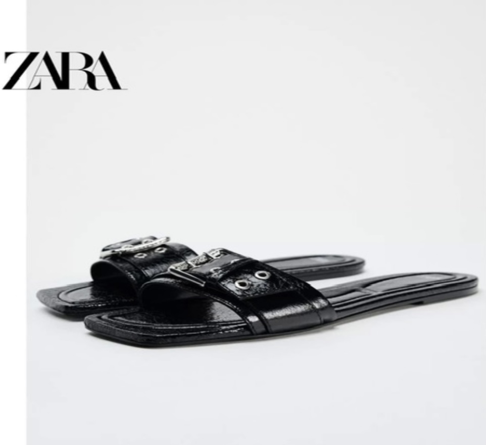 Zara giày nữ mới mùa thu khóa đen dây bản rộng trang trí mặc ngoài dép bệt đầu vuông giày đi biển thường ngày